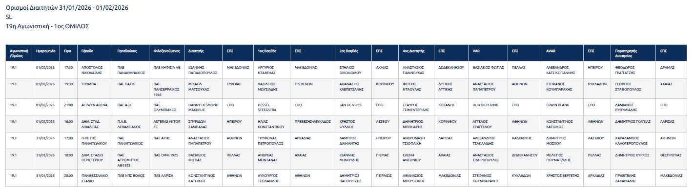 Οι διαιτητές των αγώνων της 19ης αγωνιστικής (31/1 & 1/2/2026)