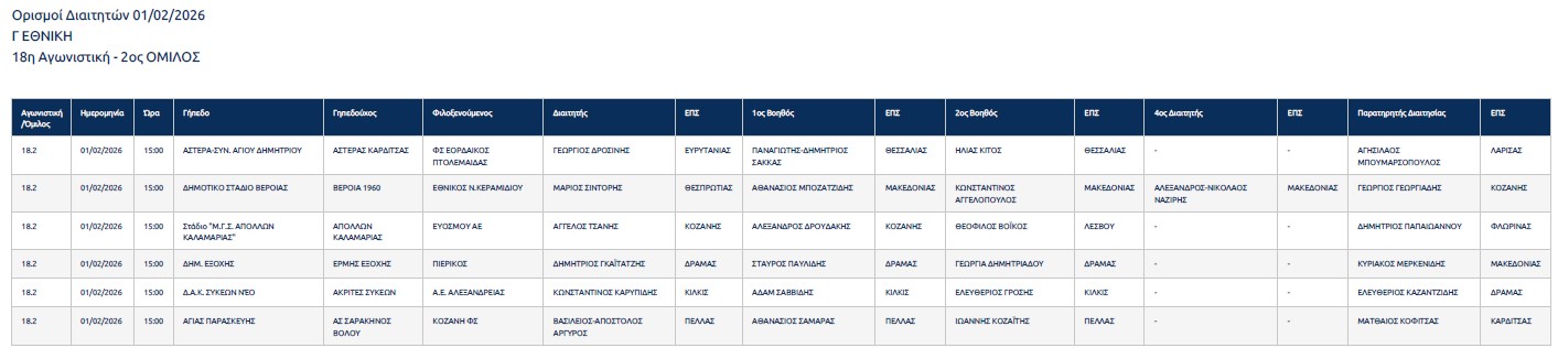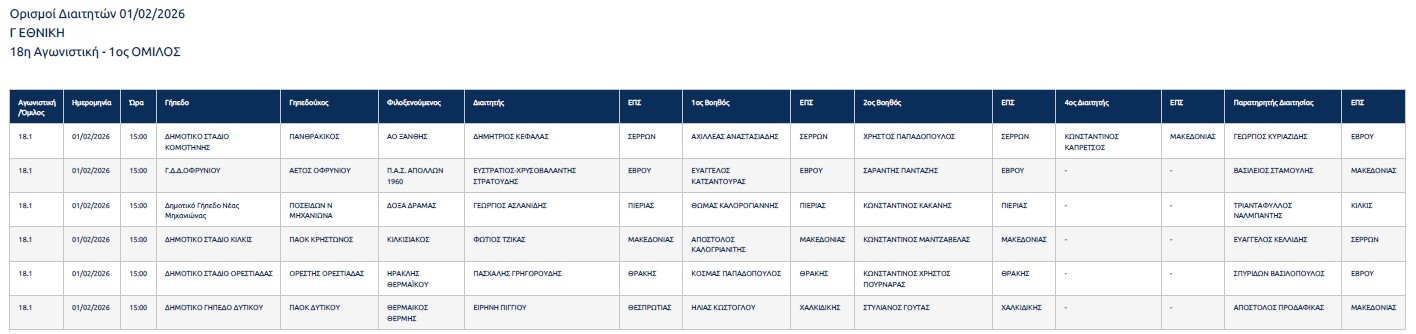 Οι διαιτητές των αγώνων της Κυριακής 1/2/2026