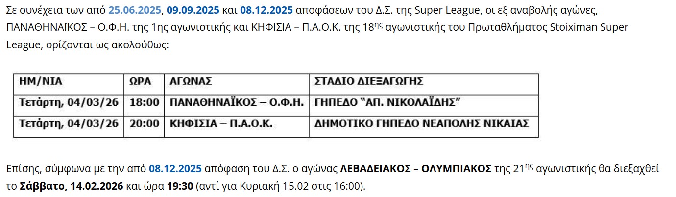 Την Τετάρτη 4/3/2026 οι αναβληθλέντες αγώνες