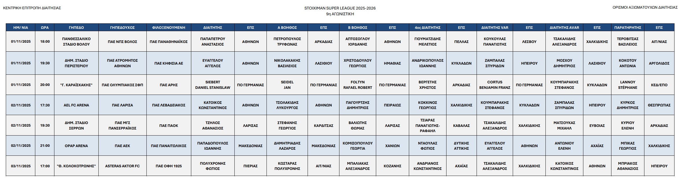 Οι διαιτητές των αγώνων 1-2/11/2025